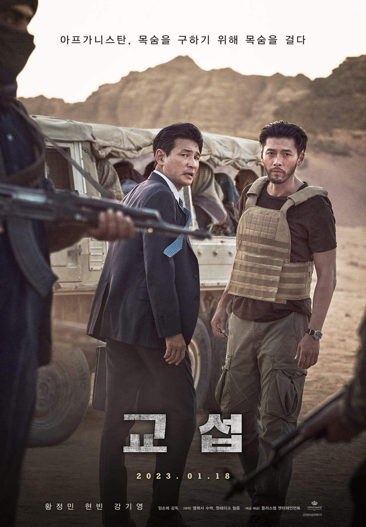 영화 교섭은 2023년 1월 18일에 개봉한 한국영화로 샘물교회 선교단의 아프가니스탄 피랍 사건을 배경으로 제작된 실화 바탕의 영화이다. 극중 주인공이자 교섭 전문 외교관인 정재호 역에 황정민이 맡았다. 정재호는 열정이 넘치는 인물이자 탈레반의 소굴 안에서도 방탄조끼를 입지 않는 등의 대담함을 가지고 있는 인물이다. 현빈이 맡은 박대식은 한국인 인질들을 구하기 위해 낯선 땅에서 고군분투하는 국정원 요원으로 아프가니스탄 피랍 사건이 일어나기 전 이라크에서 구출작전에 실패했지만 대체할 인력이 없어 복직하게 되는 인물이다. 국정원 요원이라는 특성상 타국의 문화를 받아들이고 그것을 이용하는 데 능숙한 인물이다. 그리고 강기영이 맡은 압둘 카림 카심(한국이름은 이봉한이다.) 은 아프가니스탄 내 유일한 파슈토어 통역사이다. 도박에 빠져있지만 압둘 카림 카심(이봉한)만큼 당장의 겉모습은 아프가니스탄과 구별이 안될 정도로 융화가 잘 되어있는 인물이다. 통역사를 맡은 만큼 언어구사력은 거의 현지인 수준으로 단 한번의 막힘없이 완벽하게 통역해냈으며, 문화지식 역시 최고 수준을 갖추고 있어 인질을 무사히 빼내오는 데 큰 역할을 하기도 한 인물이다. 이 세 인물을 중심으로 이승철, 정재성, 박형수, 남명렬, 신문성 등 여러 인물들과 피랍 사건을 해결하기 위한 작전을 수행한다.