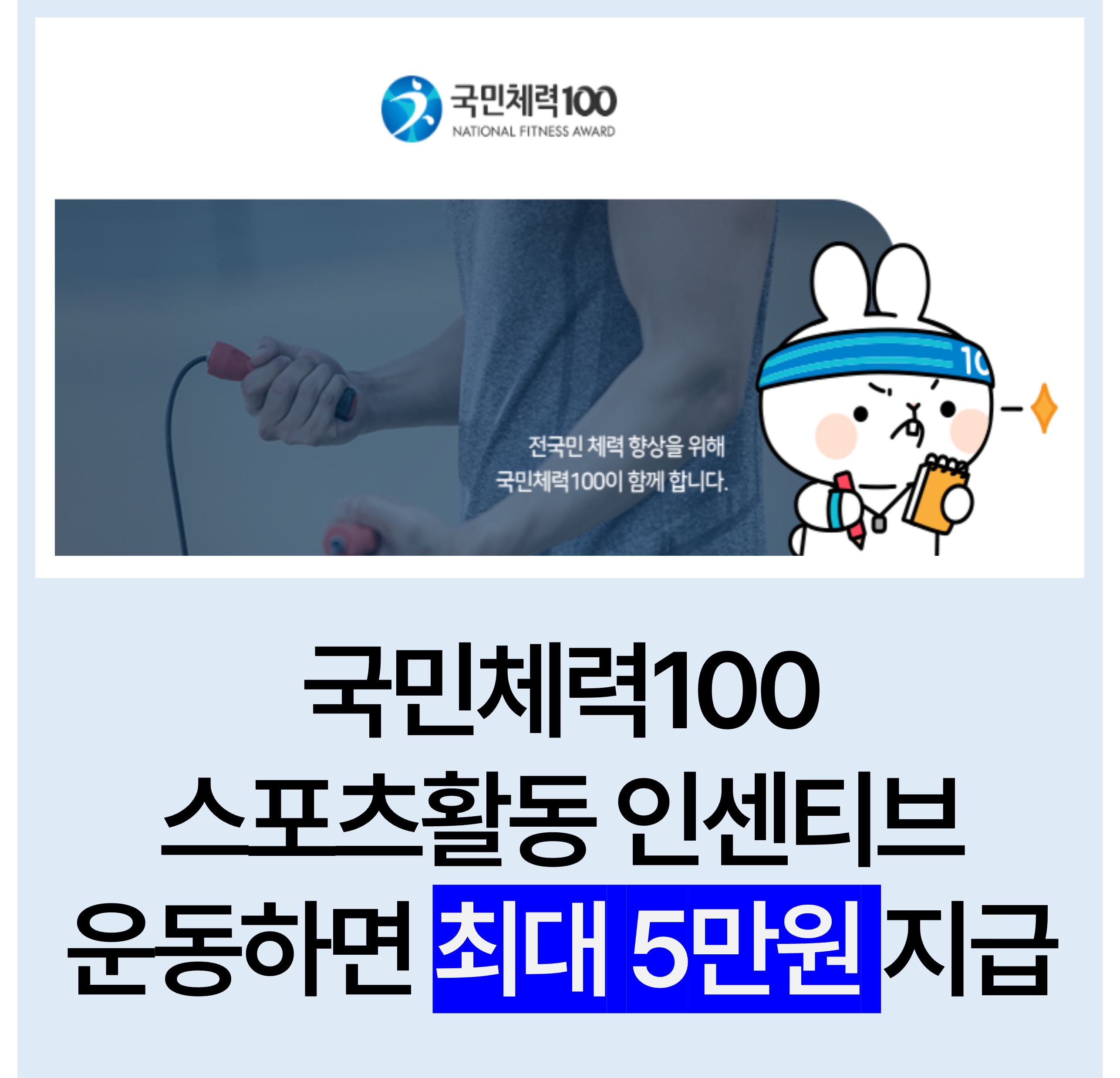 스포츠활동 인센티브는 국민체력100의 체력관리 서비스 및 스포츠 활동 참여 후 QR코드를 찍으면 적립 기준에 따라 인센티브를 최대 5만원까지 지급하고 지급받은 인센티브를 상품으로 교환할 수 있는 대국민 체력증진 서비스이다. 상품은 문화상품권이며, 6월 중순 이후의 상품은 제로페이에서 발행하는 스포츠상품권으로 변경될 예정이다. 단, 제로페이 가입이 불가한 만 14세 미만의 회원은 문화상품권으로만 지급된다.