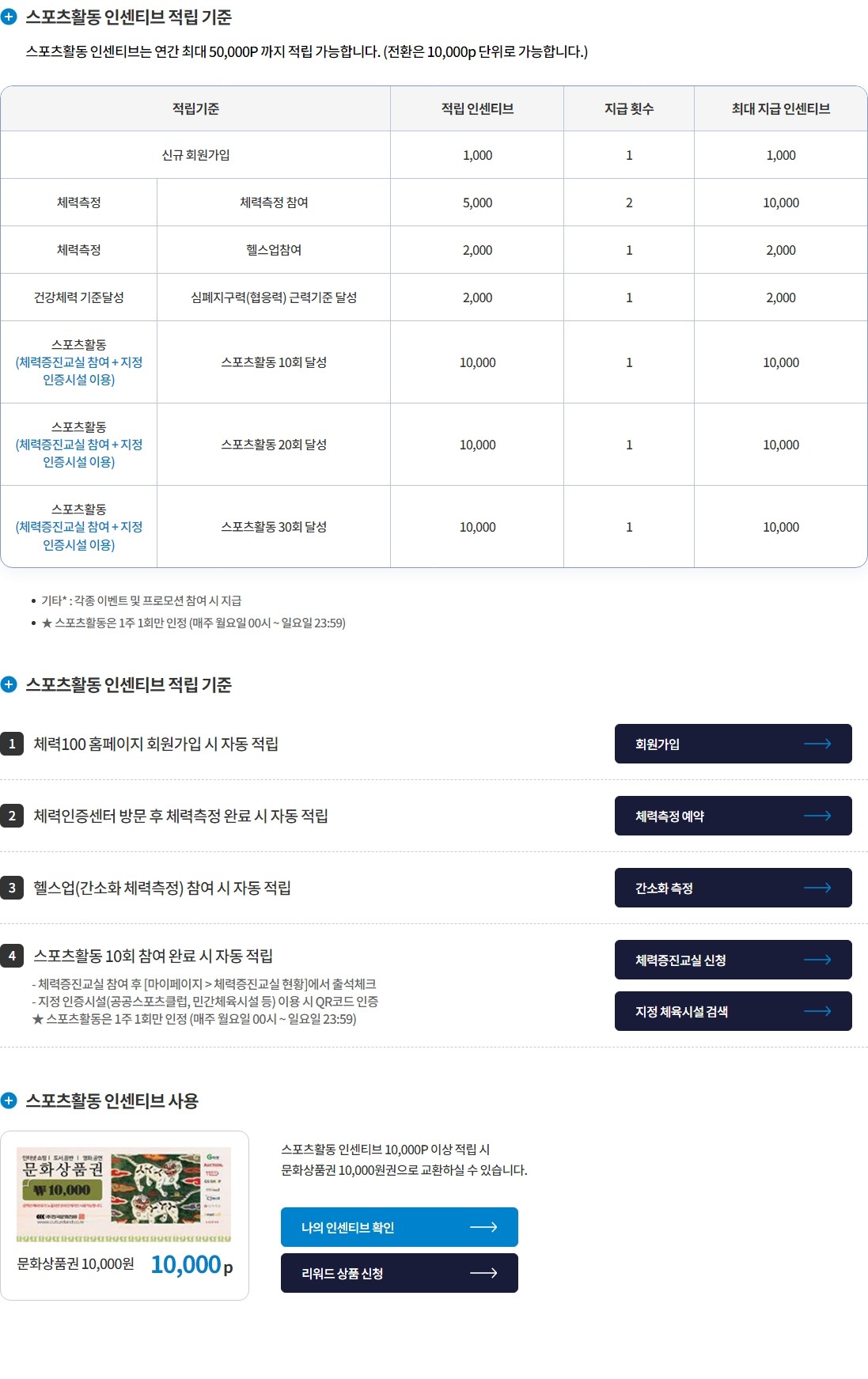 - 스포츠활동 인센티브 적립 및 사용을 위해서는 국민체력100 홈페이지 회원가입이 필수이다.